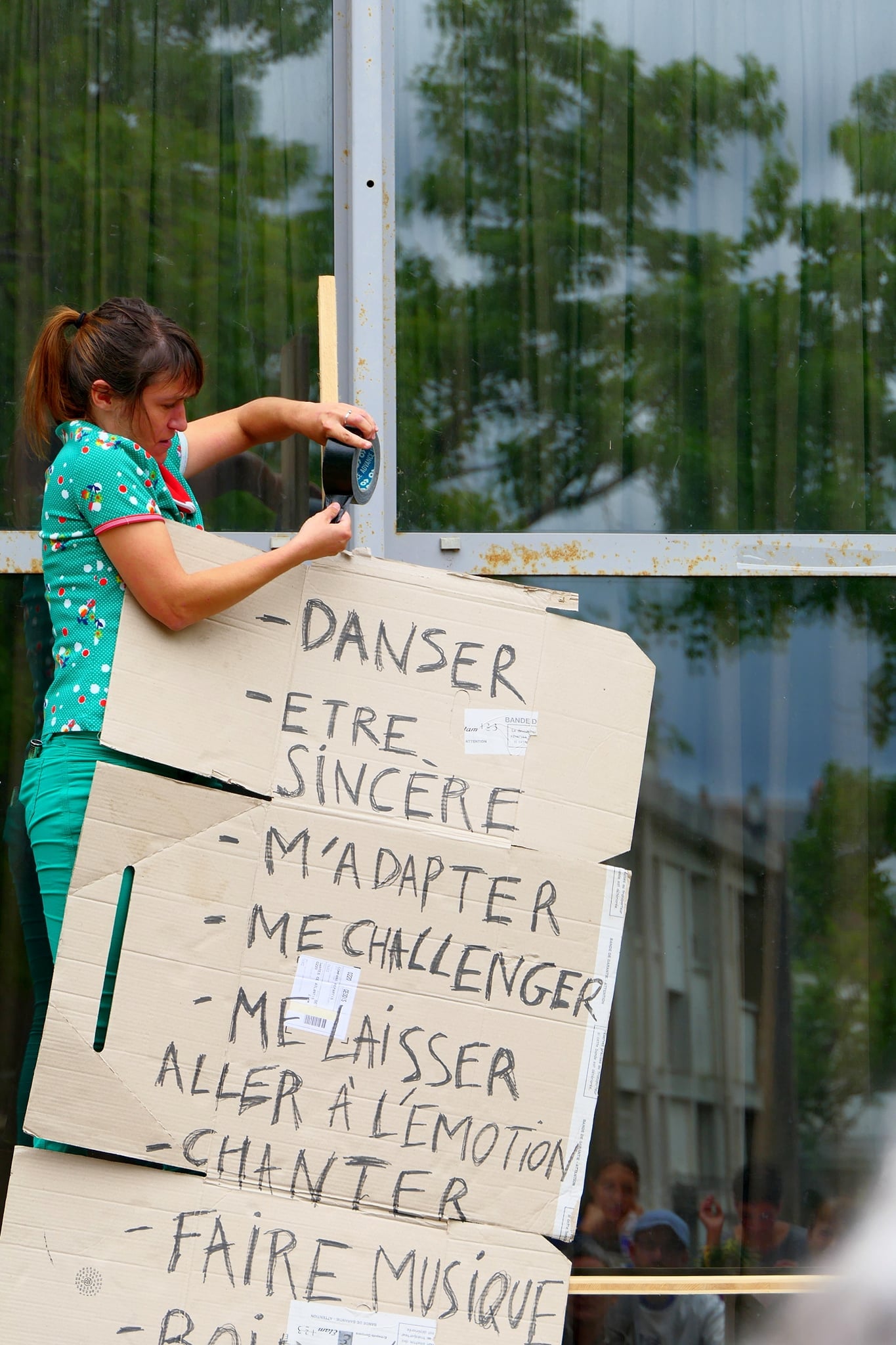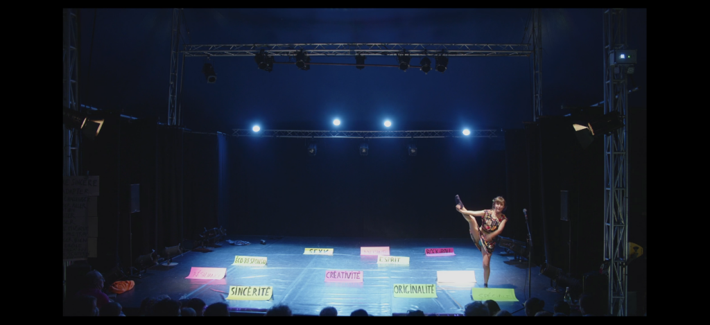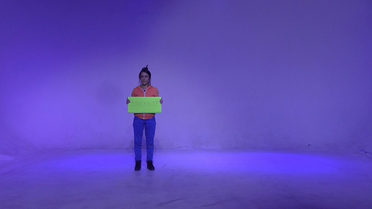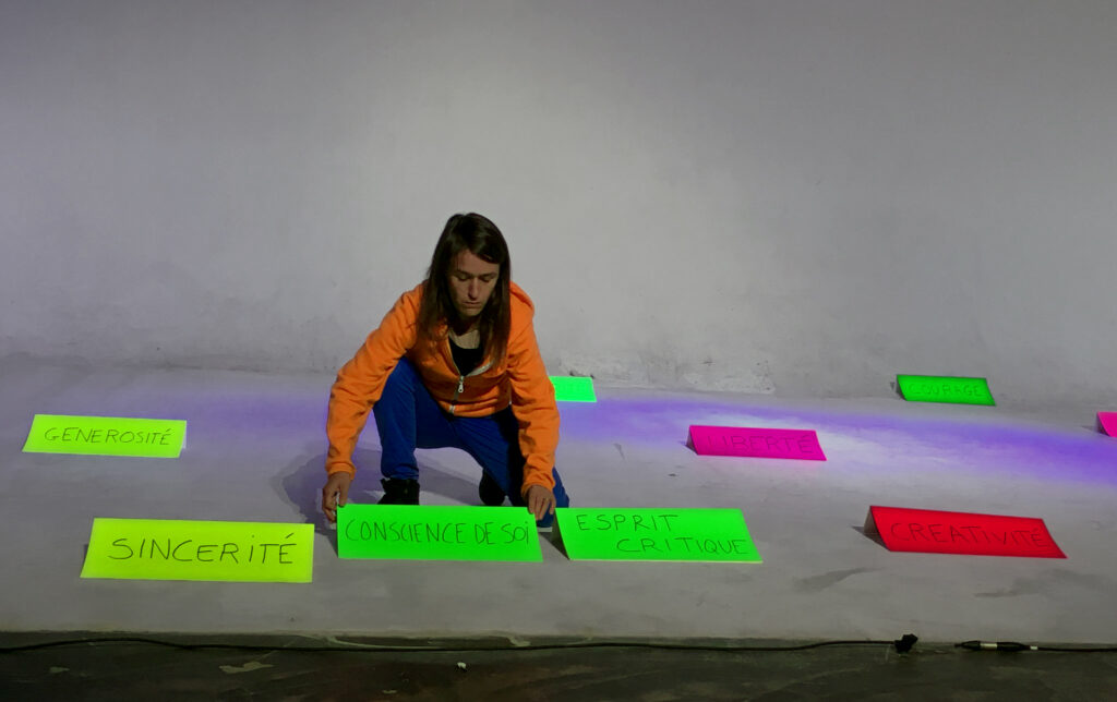 Puis, après avoir établi une liste beaucoup trop longue et ambitieuse de tâches qu’elle souhaite et promet d’accomplir pour mener à bien son entreprise de légitimisation, elle établit, en impliquant le public, une liste de critères et de valeurs auxquelles elle va tenter de se soumettre. Elle cherche ainsi à adapter son corps, sa pensée et son discours à cescases trop nombreuses et parfois paradoxales, en improvisation live devant les spectateur.ices : En 10 mn, elle va chercher à être sincère, éco responsable, sexy, généreuse, curieuse, gentille, dure, douce, courageuse, originale, etc etc.